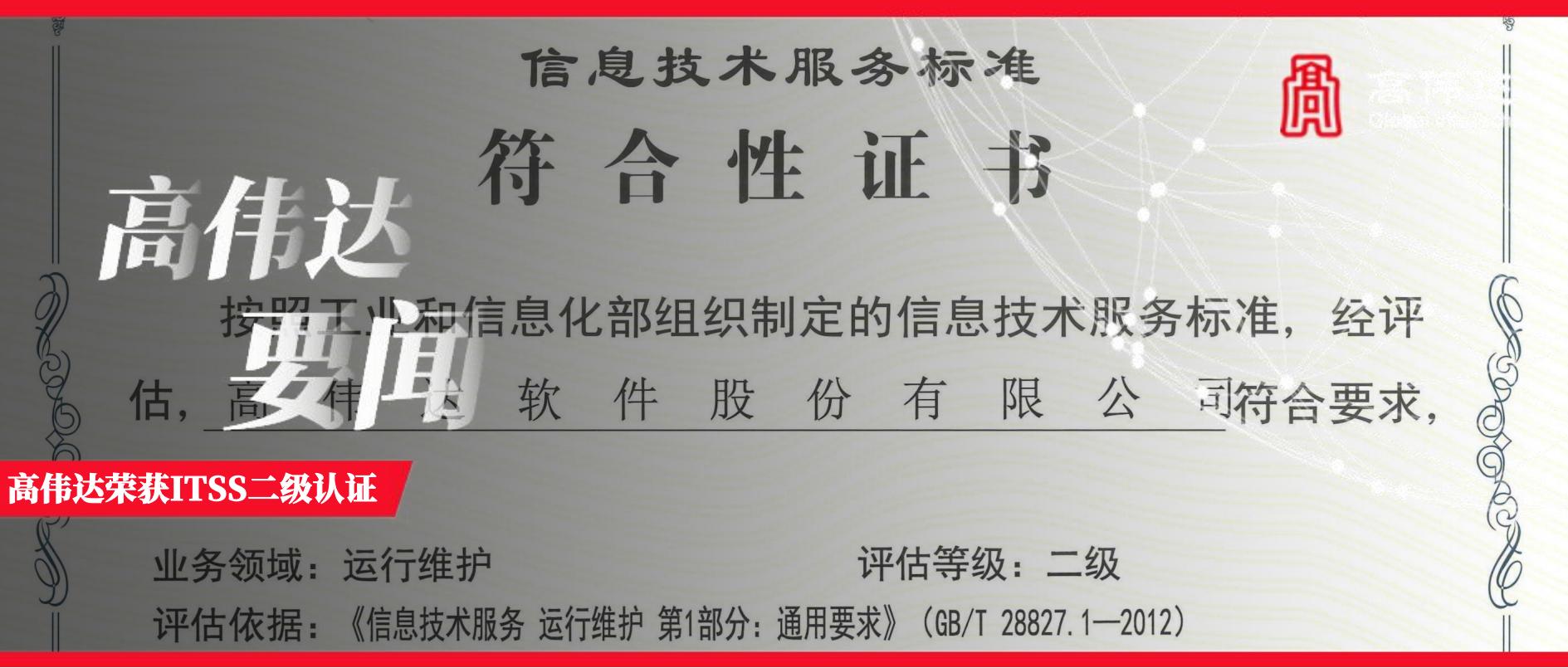 2025年3月14日,高伟达正式通过中国电子工业标准化技术协会信息技术服务分会(ITSS分会)的严格审核,荣获《信息技术服务运行维护服务能力成熟度模型》(ITSS.1-2015)二级资质认证(全国ITSS体系中,仅有10%左右的企业通过测评,最终获得二级资质)。